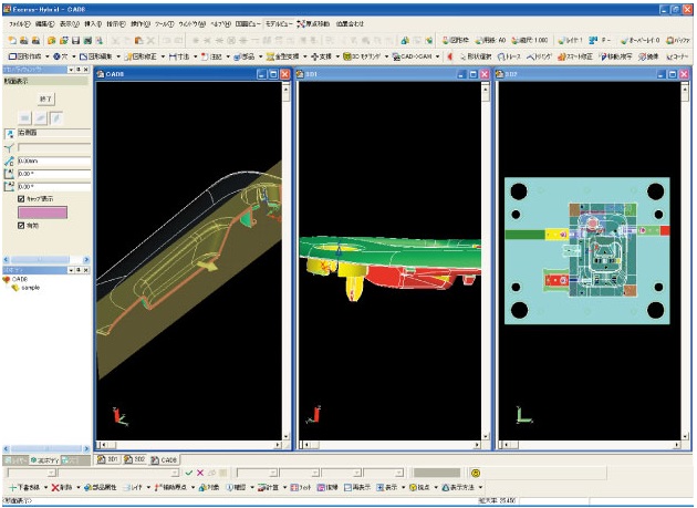 3次元モデル上の確認機能を利用し作業前後の確認が容易に行えます。断面の確認は、3次元モデルの任意箇所を表示し、抜き勾配角度の確認は、設定角度に応じ勾配不足やアンダーカット部分を色分け、平面高さは平面の高さ別に色分け表示するので、視覚的に確認することが可能です。 |