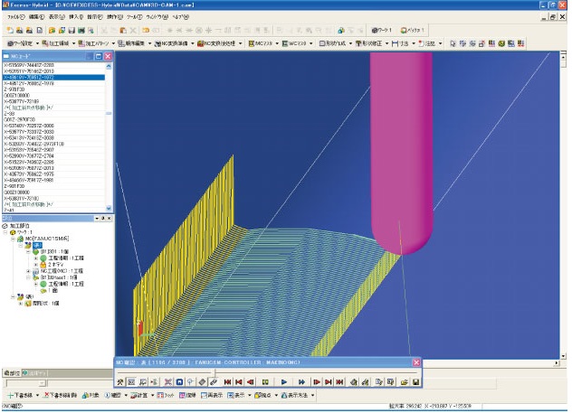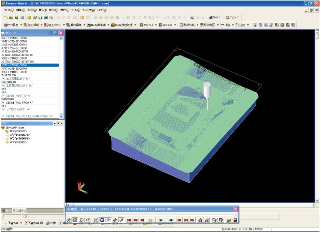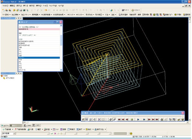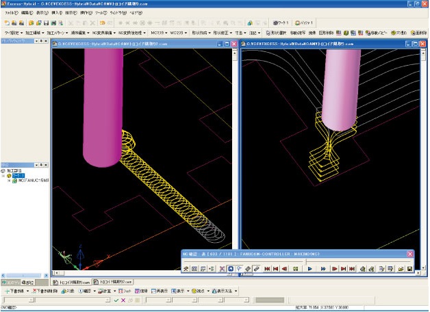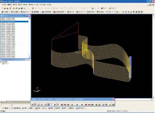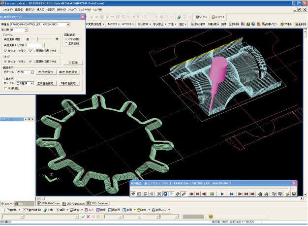 平面図と断面図の情報を基に、X-Y軸の2.5次元等高線加工が容易に行えます。また、X-Y軸だけでは加工できない形状も、X-ZやY-Zに軸変換することにより、2.5次元の加工パスを作成することが可能です。 |